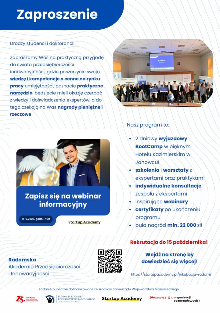 Rekrutacja trwa do 15 października 2025 r. Więcej informacji oraz formularz zgłoszeniowy dostępne są na stronie: https://startupacademy.pl/inkubacja-radom/