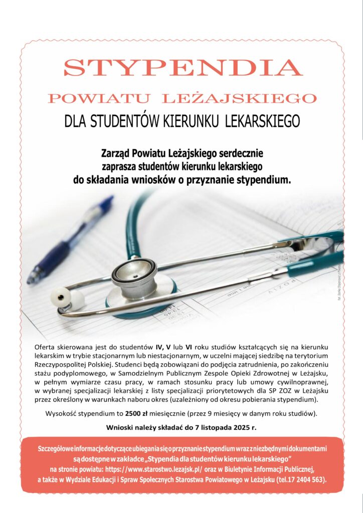 Zarząd Powiatu Leżajskiego serdecznie zaprasza studentów kierunku lekarskiego do składania wniosków o przyznanie stypendium.