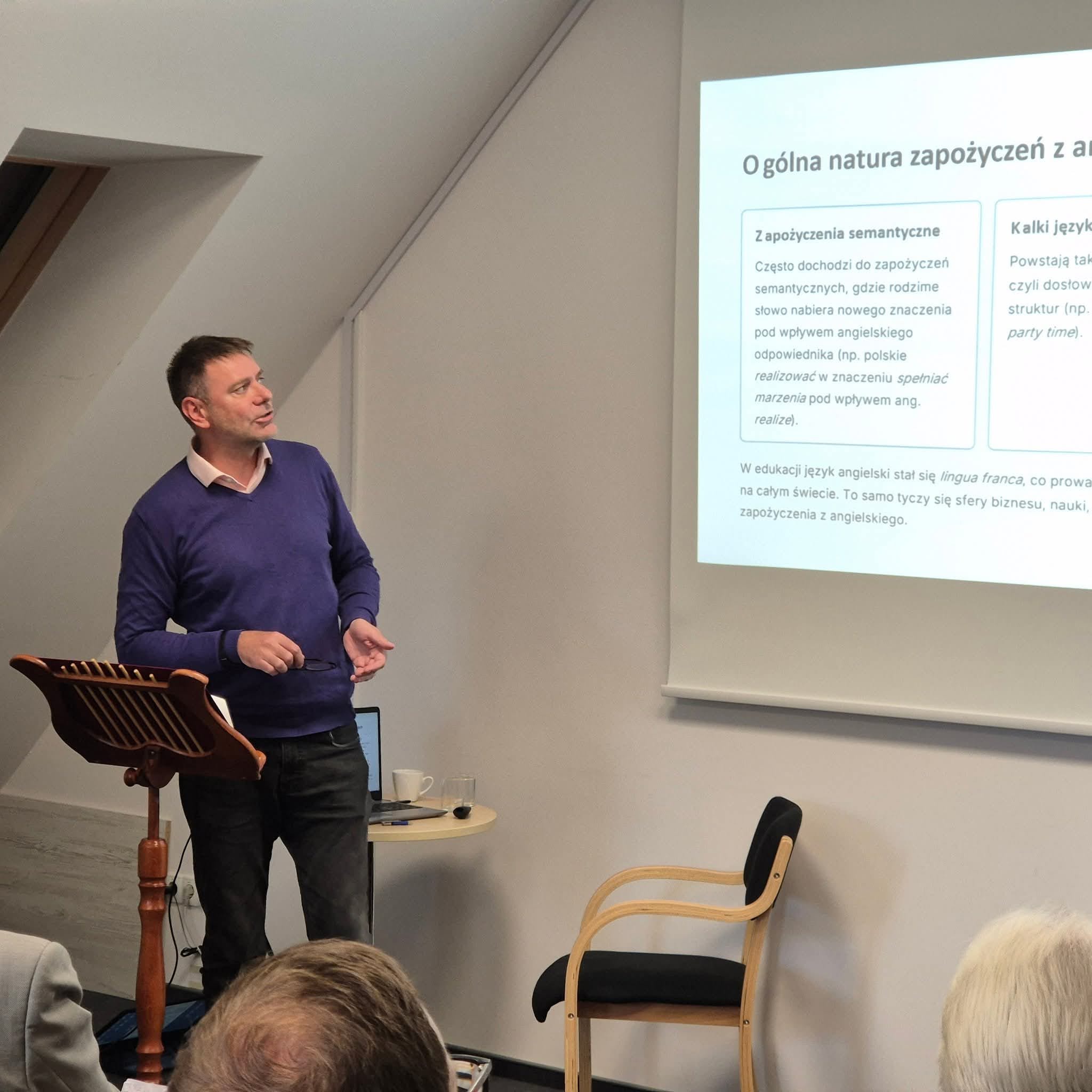 W czasie konferencji dr Gołąbek wygłosił referat naukowy pt. „Angielskie zapożyczenia leksykalne we współczesnym literackim języku kaszubskim – rekonesans badawczy”, w którym poruszona została kwestia wpływu słownictwa angielskiego na kształtujący się standardowy język kaszubski w obszarze leksyki.