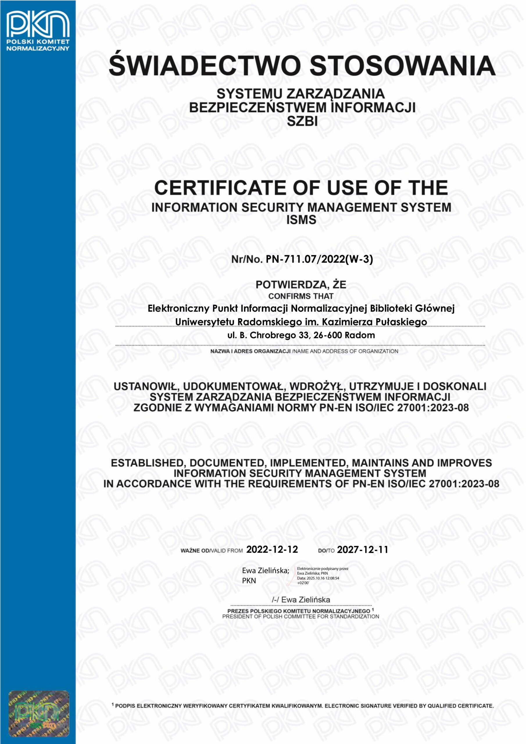 Elektroniczny Punkt Informacji Normalizacyjnej Uniwersytetu Radomskiego uzyskał Świadectwo Stosowania PKN, potwierdzające najwyższe standardy w zakresie bezpieczeństwa informacji