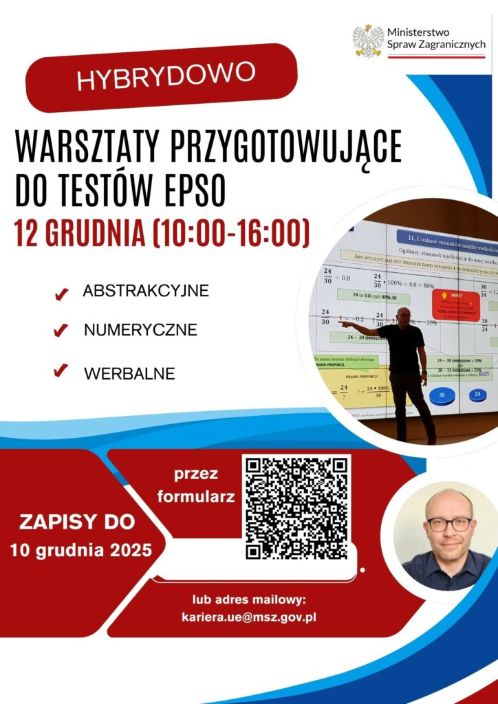 Ministerstwo Spraw Zagranicznych zaprasza studentów, absolwentów oraz wszystkie osoby zainteresowane karierą w instytucjach Unii Europejskiej na ostatnie w tym roku warsztaty przygotowujące do testów EPSO. Spotkanie odbędzie się 12 grudnia br. w Akademii Dyplomatycznej MSZ, ul. Podwale 7.