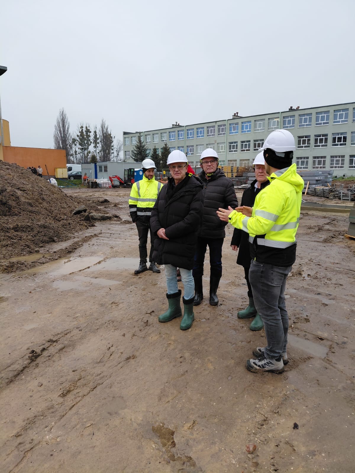 Deszczowa pogoda nie sprzyjała oględzinom ale delegacja uczelni zaopatrzona przez budowlańców w kalosze i kaski dzielnie lustrowała postęp prac a redaktor naczelny „Kuriera” Wojciech Bielawski wszystko notował i dokumentował fotograficznie. Po placu budowy oprowadzali delegację Uniwersytetu Kacper Kowalczyk, koordynator projektu i Dariusz Gozdek.