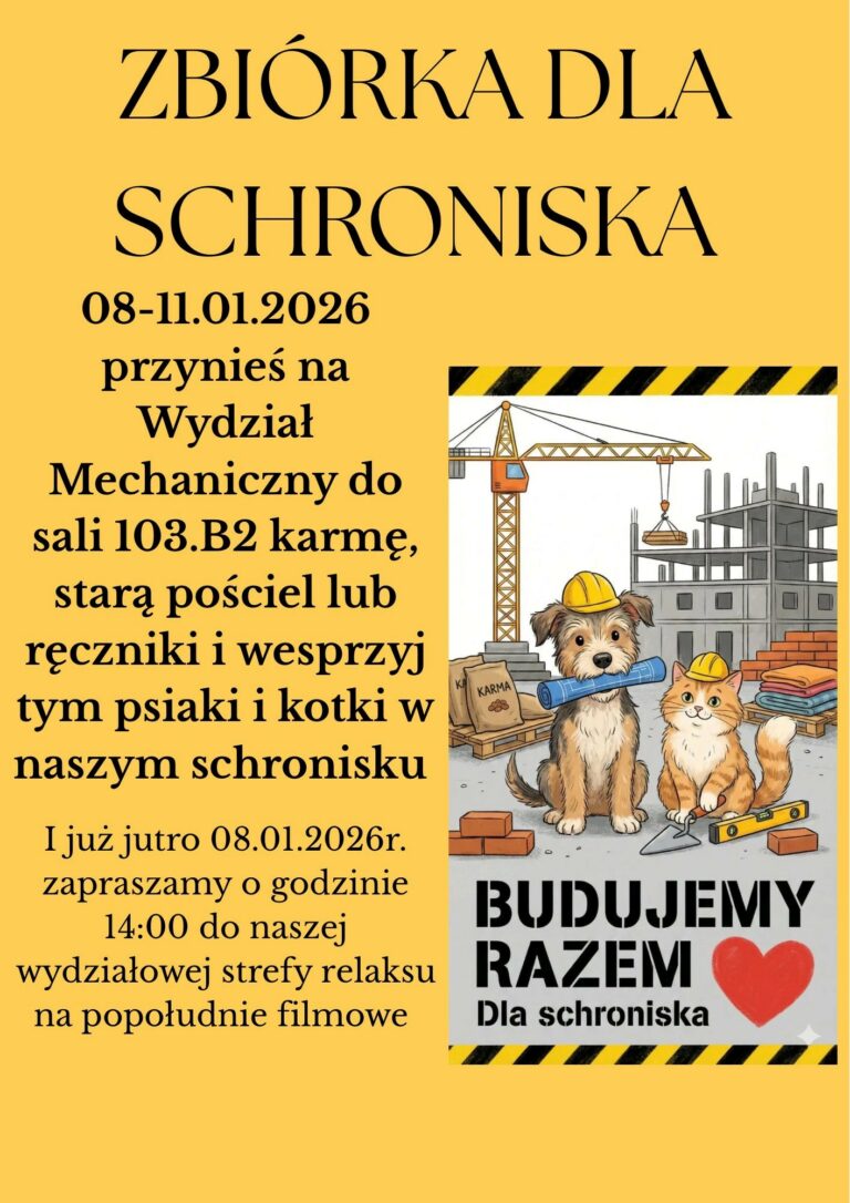 Dodatkowo, w czwartek 8 stycznia 2025 r. zbiórce towarzyszyć będzie popołudnie filmowe w nowo utworzonej Wydziałowej Strefie Relaksu (parter budynku WM). To doskonała okazja, by połączyć pomoc potrzebującym zwierzętom ze wspólnym spędzeniem czasu i integracją.