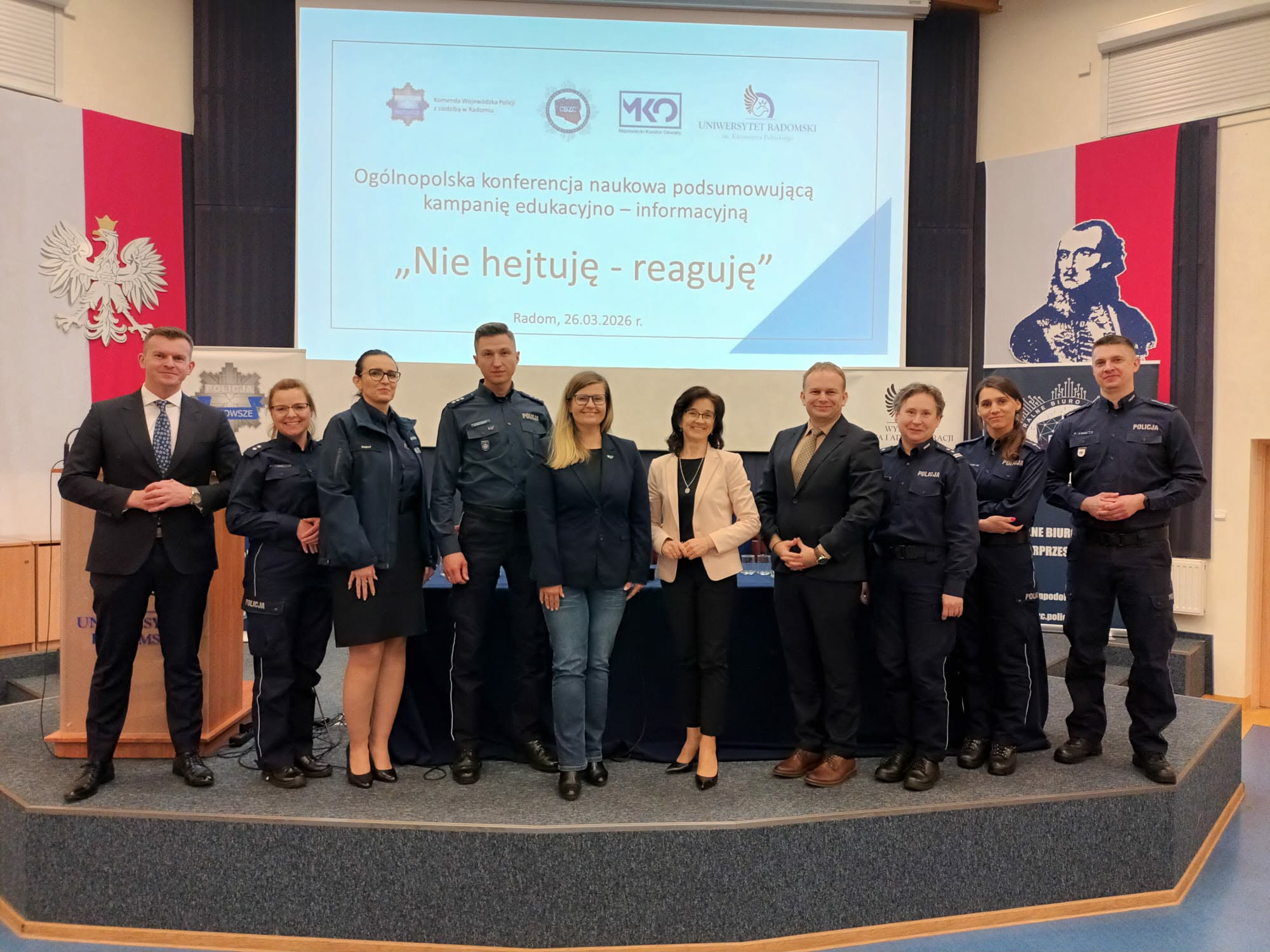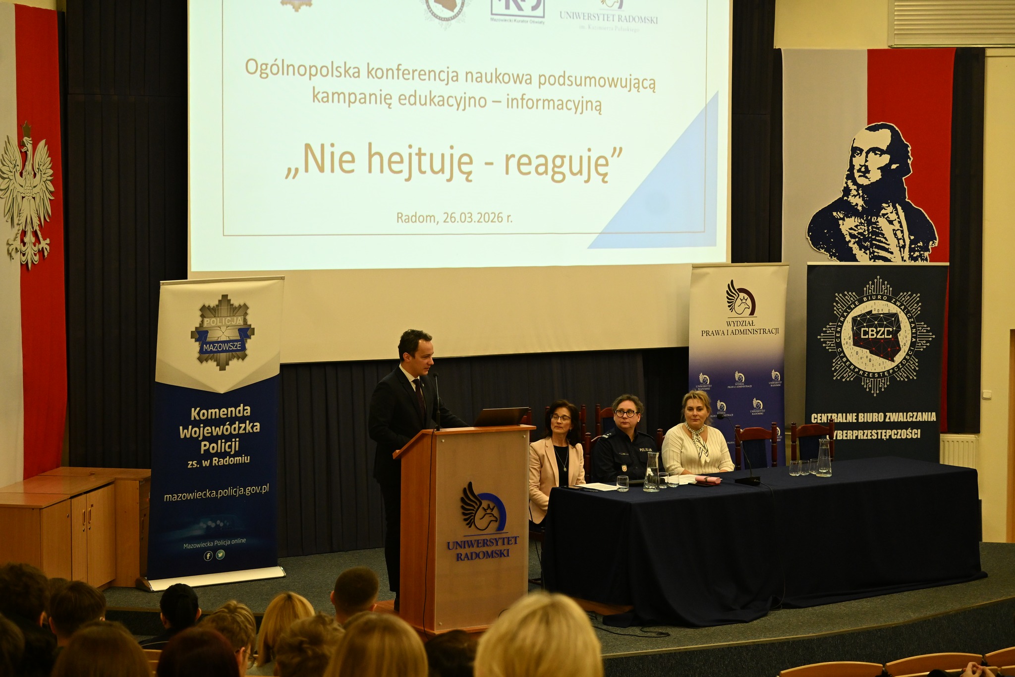26 marca 2026 r. na Wydziale Prawa i Administracji Uniwersytetu Radomskiego im. Kazimierza Pułaskiego odbyła się Ogólnopolska Konferencja Naukowa podsumowująca i jednocześnie kończąca projekt edukacyjno-profilaktyczny „Nie hejtuję – reaguję”. Wydarzenie zgromadziło ponad 600 uczniów szkół podstawowych i ponadpodstawowych z Radomia i okolic, a także nauczycieli, pedagogów oraz funkcjonariuszy Komendy Wojewódzkiej Policji z siedzibą w Radomiu.