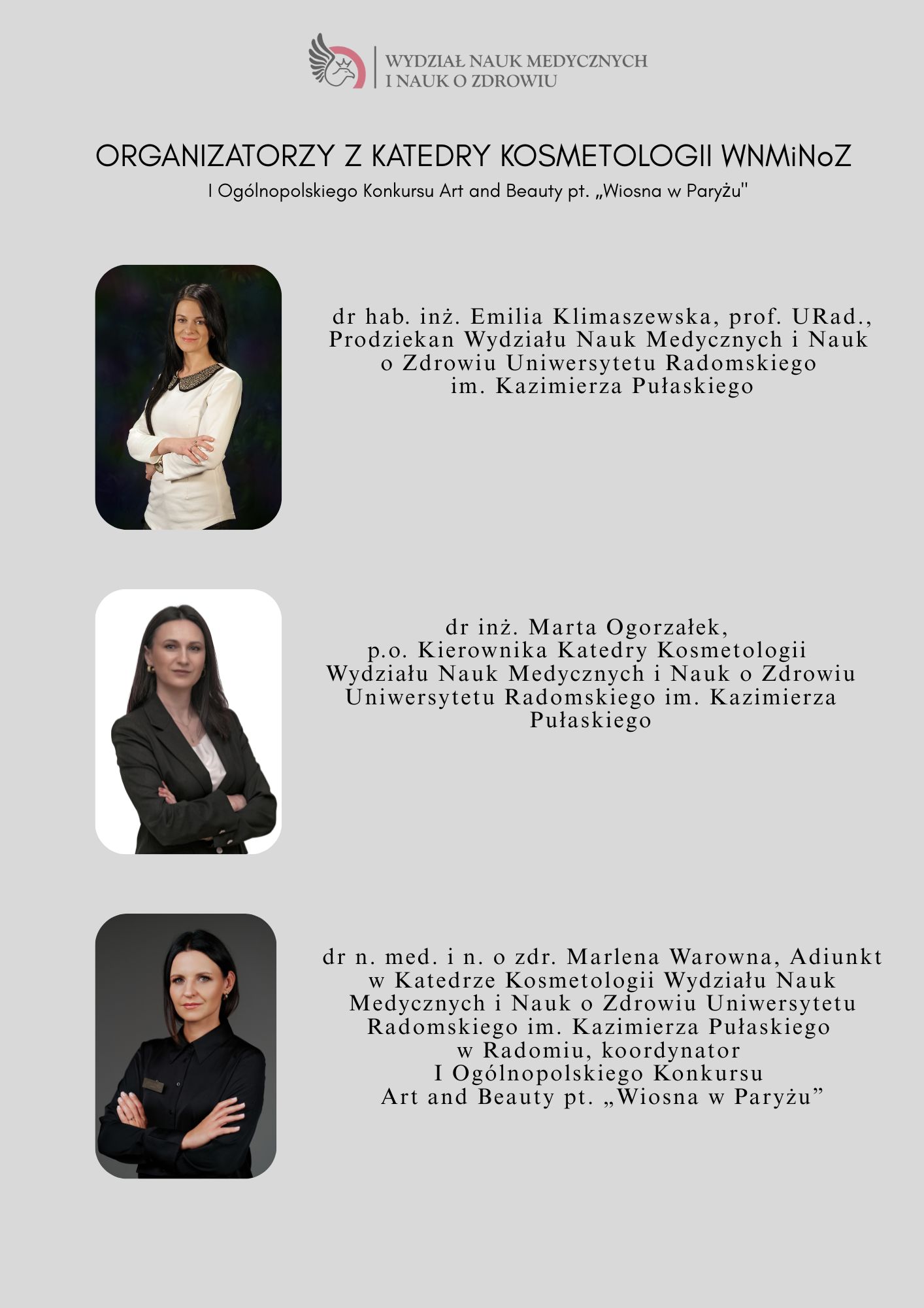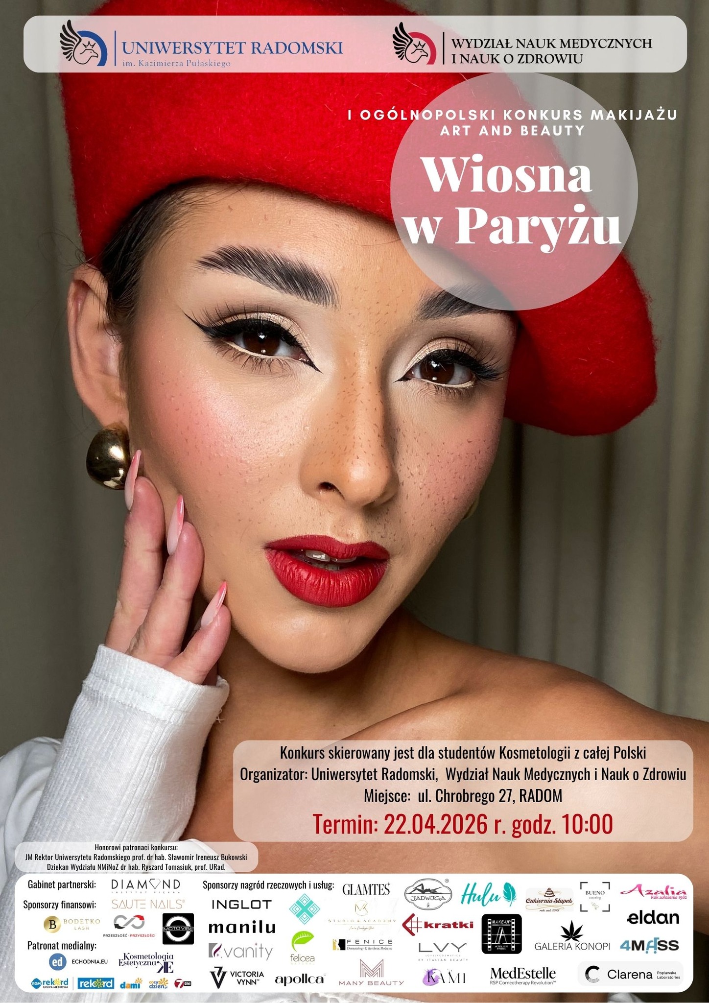 22 kwietnia 2026 r. na Wydziale Nauk Medycznych i Nauk o Zdrowiu Uniwersytetu Radomskiego odbył się pełen kreatywności i dobrej energii I Ogólnopolski Konkurs Makijażu Art and Beauty „Wiosna w Paryżu”, pod patronatem JM Rektora prof. dr hab. Sławomira Bukowskiego oraz Dziekana Wydziału NMiNoZ dr hab. n. med. Ryszarda Tomasiuka, prof. URad.