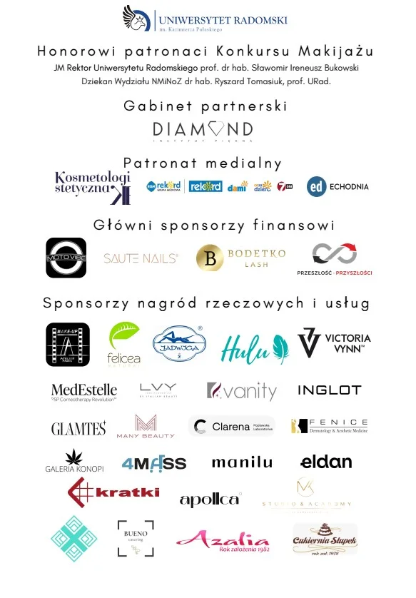 Patronat medialny nad wydarzeniem objęły: czasopismo Kosmetologia Estetyczna, a także Echo Dnia i Radomska Grupa Mediowa. Wydarzenie wsparło wielu sponsorów z branży beauty i nie tylko, w tym m.in. Inglot, Victoria VYNN, Make-up Atelier Paris, MedEstelle, Clarena, Glamtes, Hulu, Fenice Dermatology & Aesthetic Medicine oraz liczne firmy partnerskie.