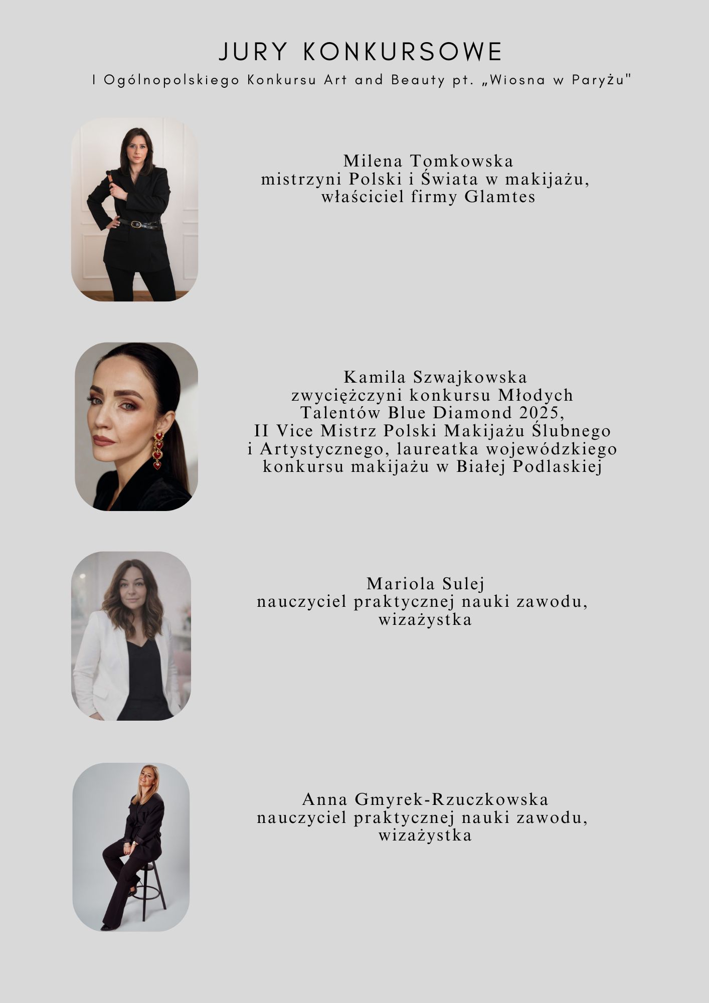 W skład jury weszli eksperci i praktycy sztuki makijażu: Milena Tomkowska (przewodnicząca jury), Kamila Szwajkowska, Mariola Sulej oraz Anna Gmyrek-Rzuczkowska. Pani Milena Tomkowska – mistrzyni świata i Polski w makijażu – zaprezentowała również pokaz makijażu francuskiego.