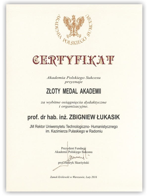 • złotym medalem Akademii Polskiego Sukcesu – za szczególne osiągnięcia w rozwoju regionu, nauce i dydaktyce została nagrodzona nasza Uczelnia. Złotym medalem Akademii Polskiego Sukcesu i Polskiego Klubu Biznesu, za wybitne osiągnięcia naukowo – dydaktyczne oraz organizacyjne został uhonorowany również Rektor – prof. Zbigniew Łukasik.